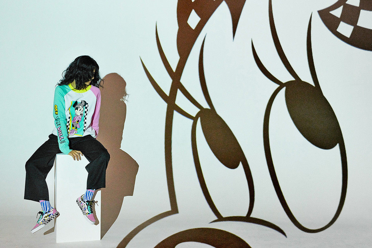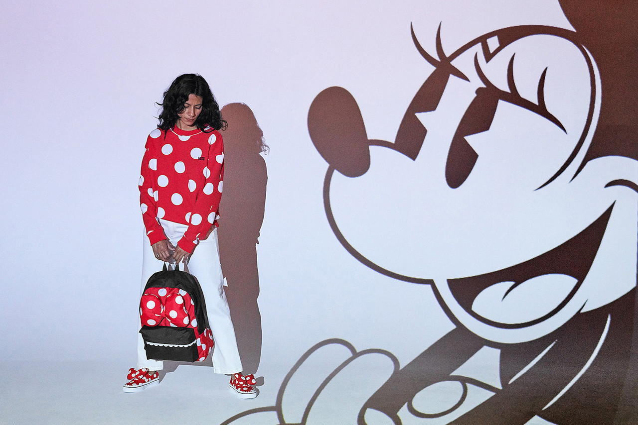 The collection is extended with the Mickey and Minnie duo with a punk makeover from the ’90s and featured on a flaming Checkerboard Slip-On. Mickey’s eternal sweetheart, Minnie Mouse, also received her own silhouette, the Authentic Gore, themed in a classic polka-dotted dress, and oversized bow with satin materialization.