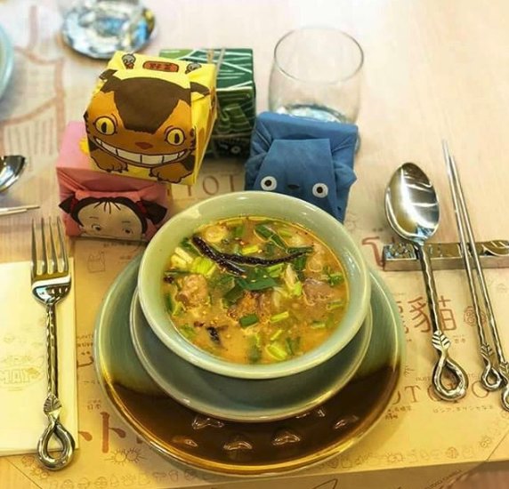 The restaurant features Miyazaki-themed decor, such as giant Totoro figure that sits in the dining rooms. Moreover, the menu items are inspired by the characters, such as steamed buns shaped like Mini Totoros.